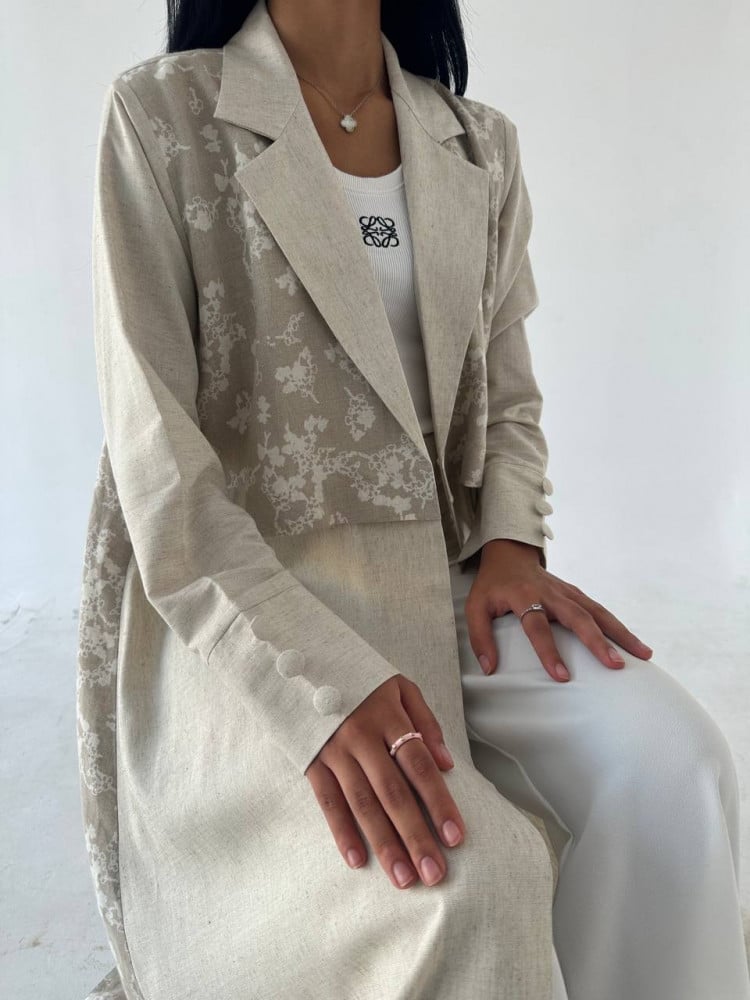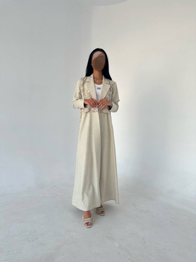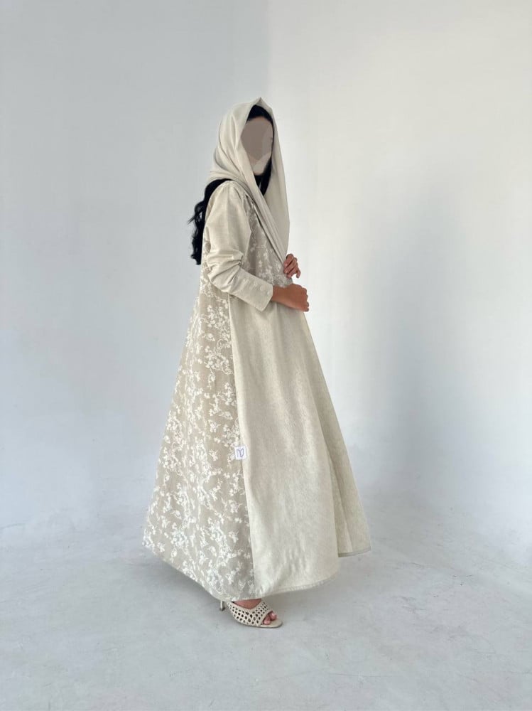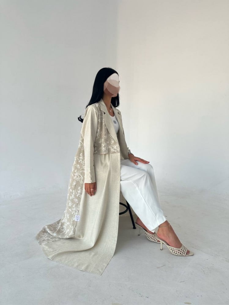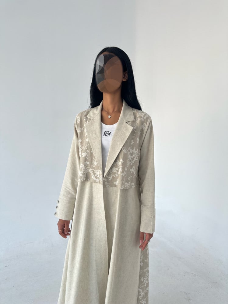 عباية قصة بليزر مع قطعة امامية مشجرة وازارير على الاكمام مع طرحة