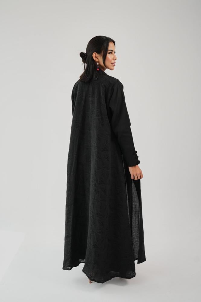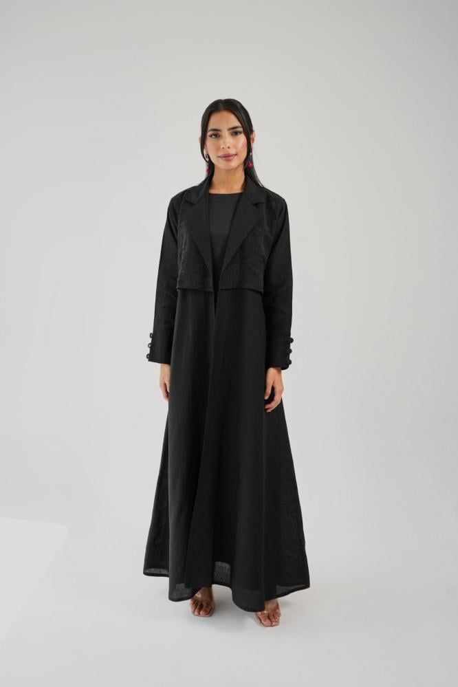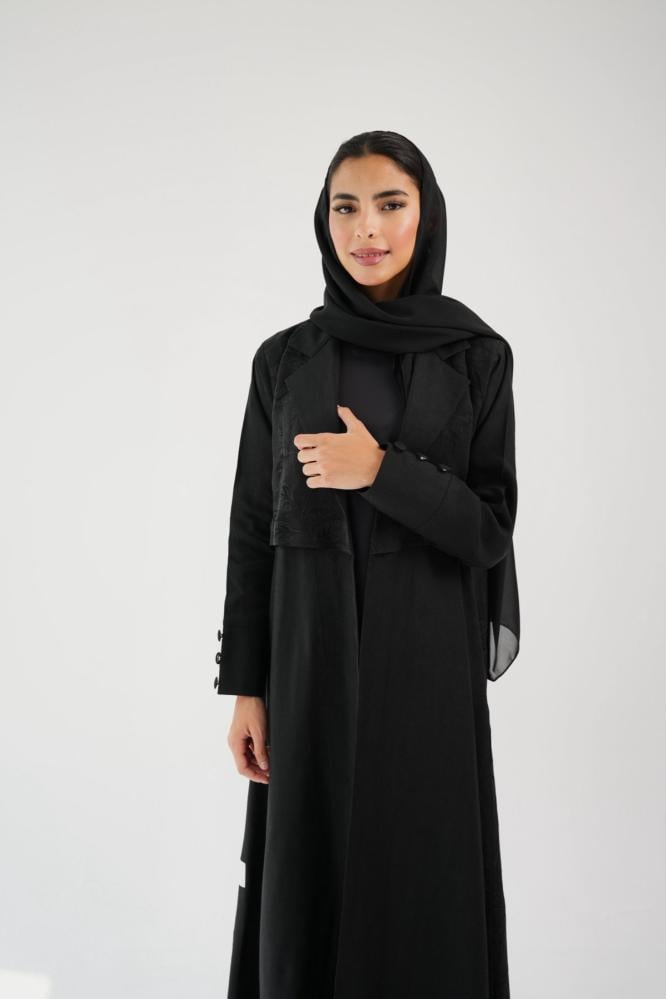 عباية قصة بليزر مع قطعة أمامية مشجرة و ازارير على الاكمام مع طرحة