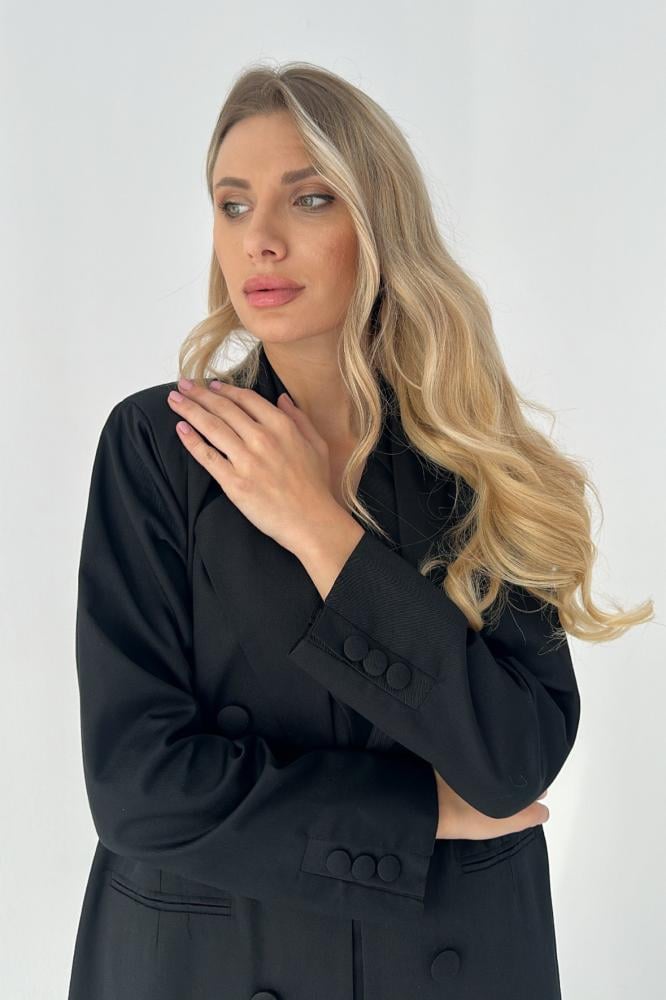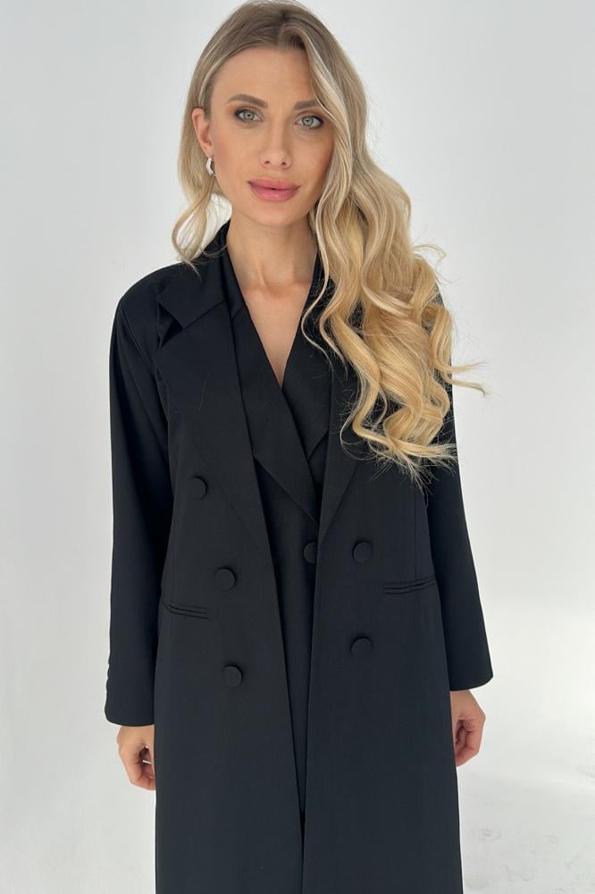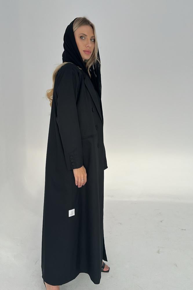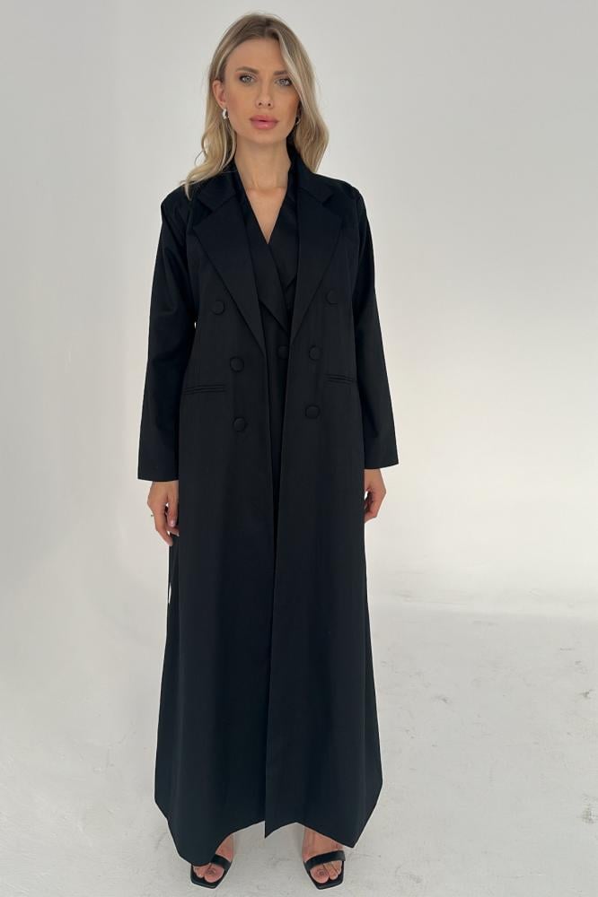 عباية بتصميم بليزر كلاسيكي مبطنة من الداخل مع ازارير في الامام و على الاكمام و جيوب عملية