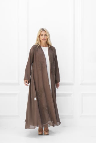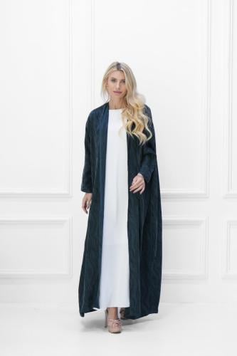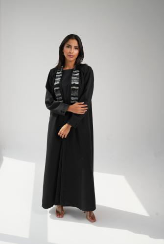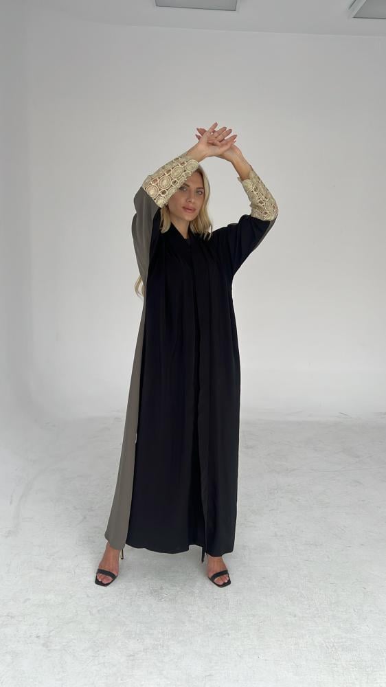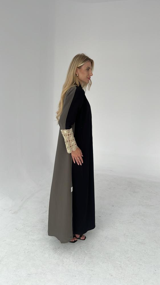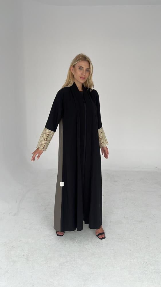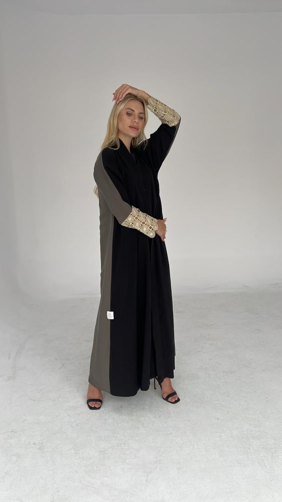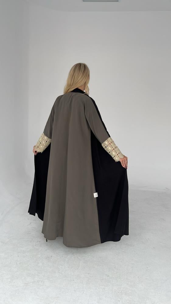 عباية بقصة كلوش خفيف باللونين الاسود و الزيتي و أكمام من القصب الذهبي