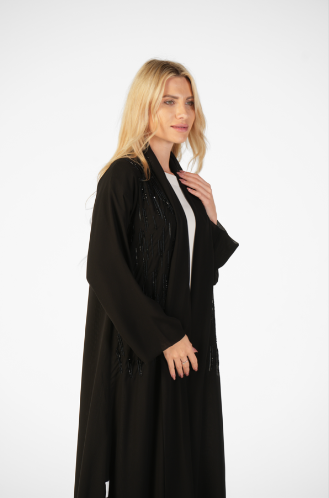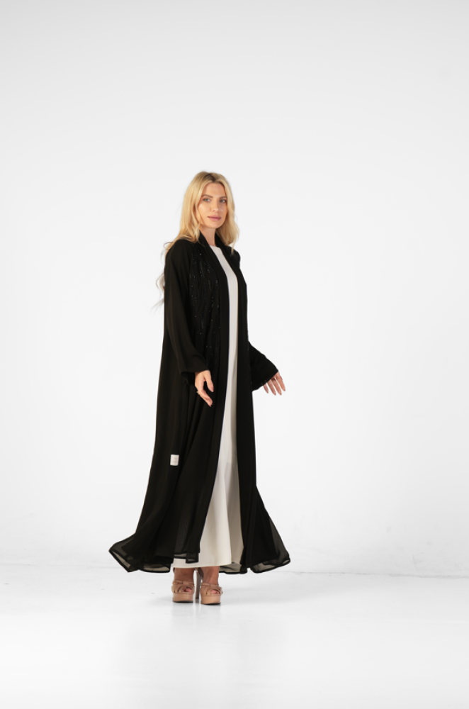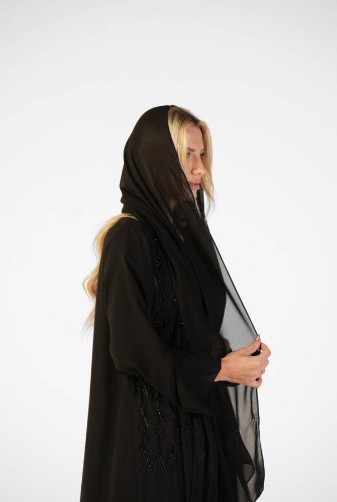 عباية دبل شيفون مطرزة يدوياً من الأمام باللون الأسود مع طرحة سادة
