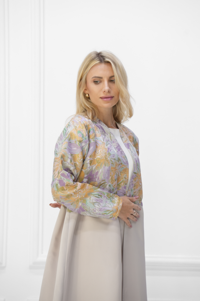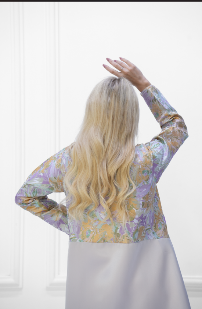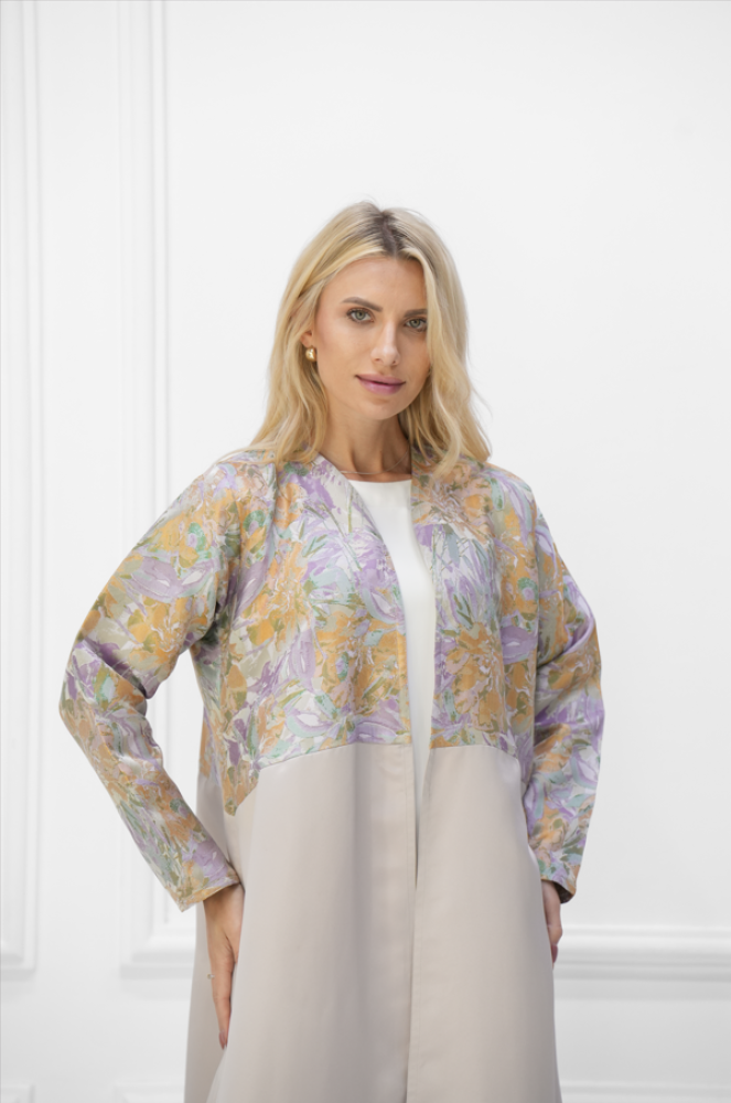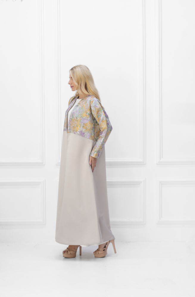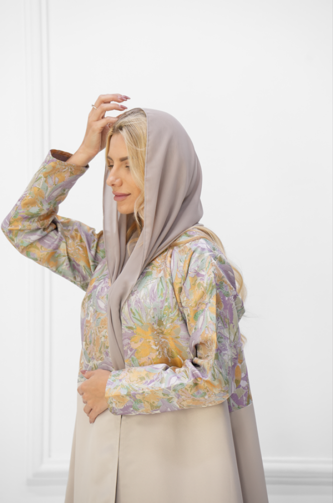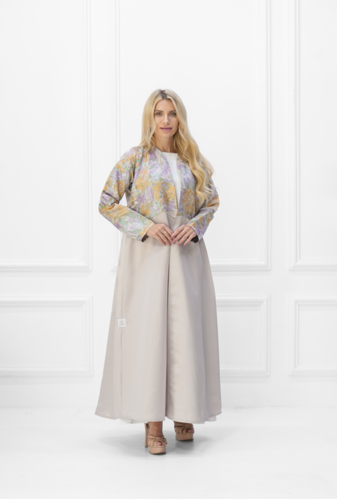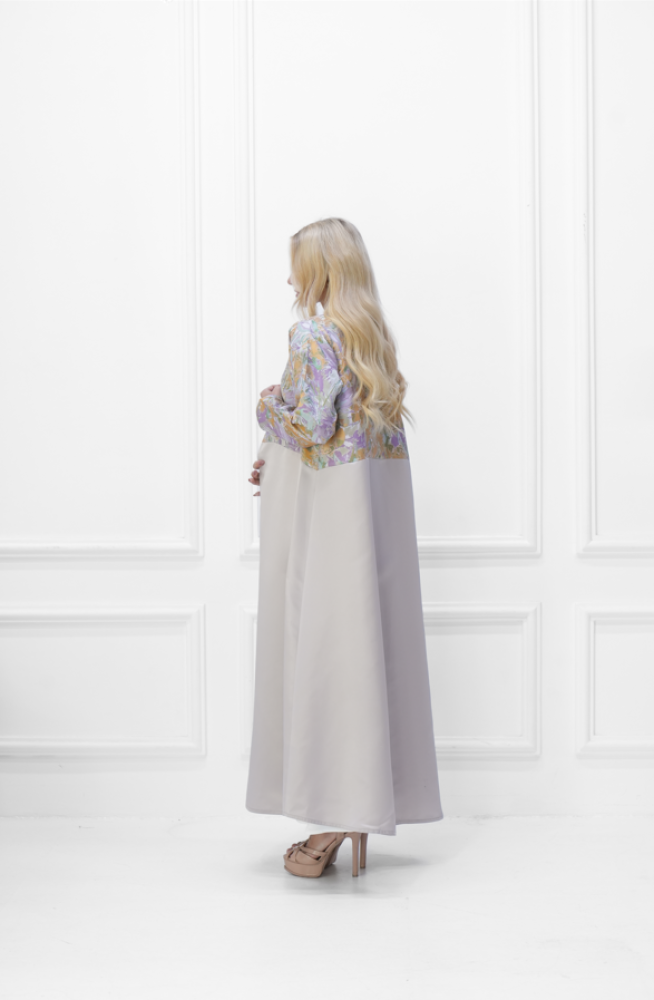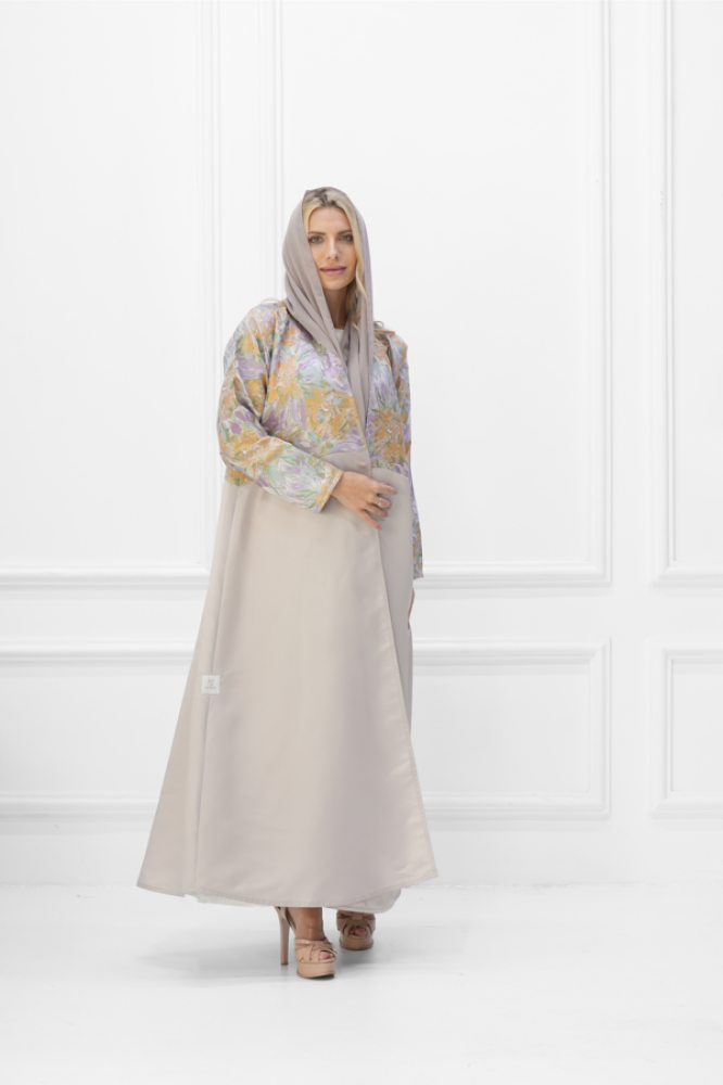 عباية تفته بقصة كلوش مع قطعة جاكار مشجرة و طرحة ليزر باللون الرمادي